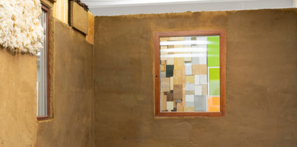 Gegenübergestellt werden in der Installation Bemusterungsproben aus dem Nachlass eines Architekturbüros und so genanntes Abfallmaterial: lehmhaltiger Erdaushub, Rohwolle, gebrauchte Thermopenfenster.